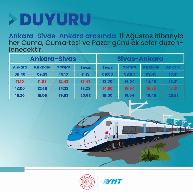 Yolcu yoğunluğu ve taleplerinin karşılanması için Ankara-Sivas YHT hattında 11 Ağustos itibarıyla Cuma, Cumartesi ve Pazar günleri karşılıklı 8 sefer (4+4) yapılmaya başlanacak.