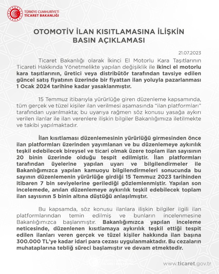 İkinci El Motorlu Kara Taşıtlarının Ticareti Hakkında Yönetmelikte yapılan değişiklik ile ikinci el motorlu kara taşıtlarının, üretici veya distribütör tarafından tavsiye edilen güncel satış fiyatının üzerinde bir fiyattan ilan yoluyla pazarlanması 1 Ocak 2024 tarihine kadar yasaklandığı anımsatılan açıklamada, “15 Temmuz itibarıyla yürürlüğe giren düzenleme kapsamında, tüm gerçek ve tüzel kişiler ilan verilmesi aşamasında ‘ilan platformları’ tarafından uyarılmakta; bu uyarıya rağmen söz konusu yasağa aykırı verilen ilanlar ile ilan verenlere ilişkin bilgiler Bakanlığımıza iletilmekte ve takibi yapılmaktadır. İlan kısıtlaması düzenlemesinin yürürlüğü girmesinden önce ilan platformları üzerinden yayımlanan ve bu düzenlemeye aykırılık teşkil edebilecek bireysel ve ticari olmak üzere toplam ilan sayısının 20 binin üzerinde olduğu tespit edilmiştir. İlan platformları tarafından üyelerine yapılan uyarı ve bilgilendirmeler ile Bakanlığımızca yapılan kamuoyu bilgilendirmeleri sonucunda bu sayının düzenlemenin yürürlüğe girdiği 15 Temmuz 2023 tarihinden itibaren 7 bin seviyelerine gerilediği gözlemlenmiştir. Yapılan son incelemede, anılan düzenlemeye aykırılık teşkil edebilecek toplam ilan sayısının 5 binin altına düştüğü anlaşılmıştır.” denildi.