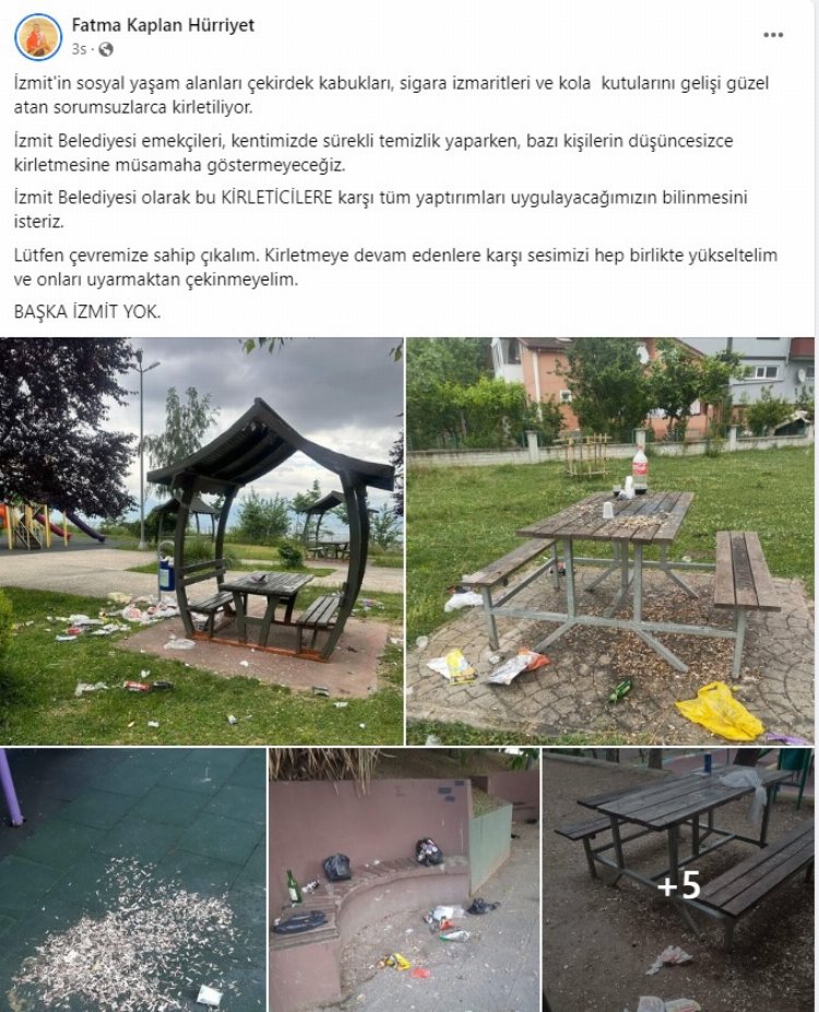KOCAELİ (İGFA) – İzmit’in farklı noktalarında bulunan sosyal yaşam alanlarının tüm uyarılara rağmen kirletilmesi üzerine İzmit Belediye Başkanı Fatma Kaplan Hürriyet, yaptığı sosyal medya paylaşımı ile tepki gösterdi.