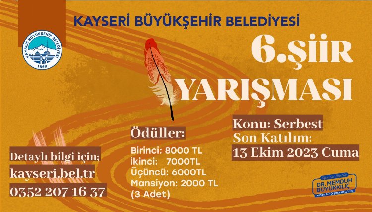 Şehrin kültür ve sanat faaliyetlerine her zaman destek olan, şiir ve hikâye yarışmalarını her yıl düzenli olarak sürdüren Kayseri Büyükşehir Belediyesi, bu yıl da şiir yarışmasını gerçekleştiriyor. 6’ncısı düzenlenen yarışmada, dereceye giren yarışmacılardan 1’inciye 8 bin, 2’nciye 7 bin, 3’üncüye 6 bin ve 2 biner TL’lik 3 adet mansiyon ödülü ile toplam 27 bin TL’lik ödül dağıtılacak.