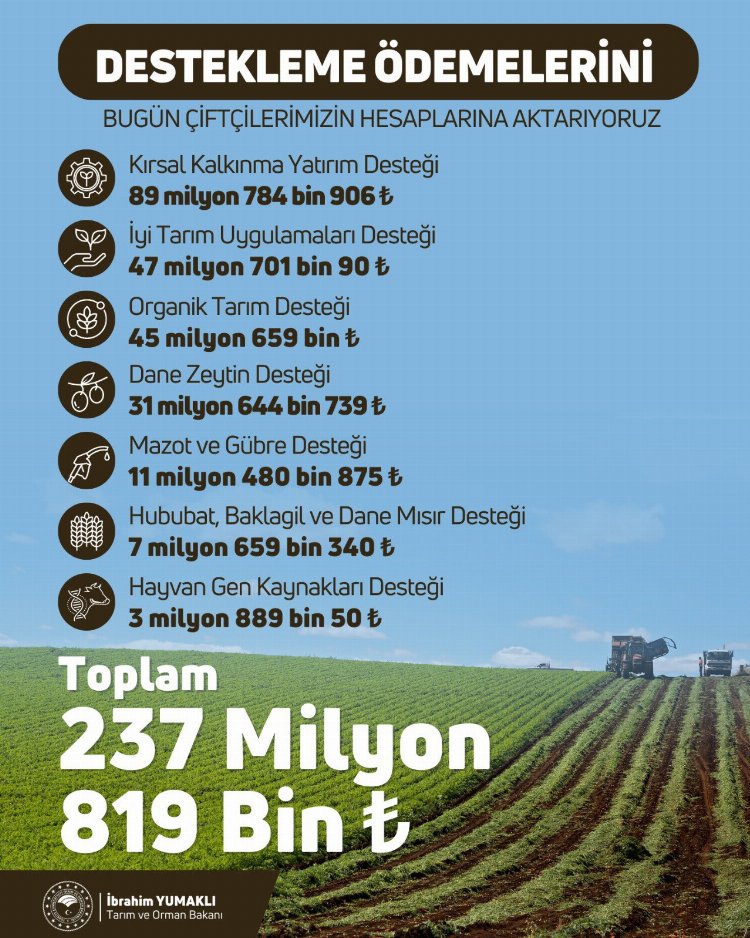 Tarım ve Orman Bakanı İbrahim Yumaklı, 237 milyon 819 bin liralık tarımsal destekleme ödemesinin bugün çiftçilerin hesaplarına aktarılacağını bildirdi.