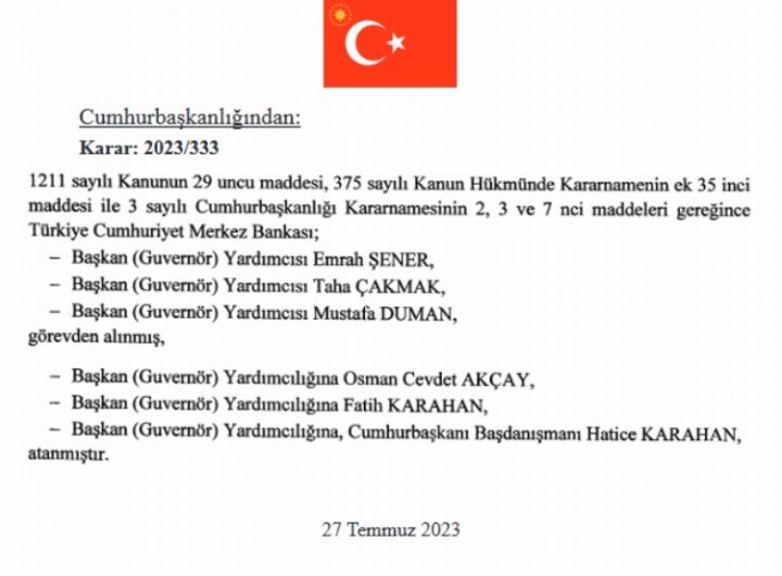 Türkiye Cumhuriyeti Merkez Bankası Başkan Yardımcıları Emrah Şener, Taha Çakmak ve Mustafa Duman Cumhurbaşkanı kararı ile görevden...