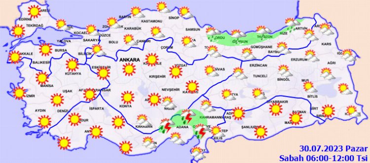 Meteoroloji Genel Müdürlüğü’nün yayımladığı günlük hava durumu tahmin raporuna göre, Doğu Karadeniz kıyıları, Doğu Anadolu’nun kuzeydoğusu, Osmaniye, Ordu ve Artvin çevreleri ile Adana’nın kuzey ve doğu kesimlerinin yerel olmak üzere sağanak ve gök gürültülü sağanak yağışlı, diğer yerlerin az bulutlu ve açık geçeceği tahmin ediliyor.