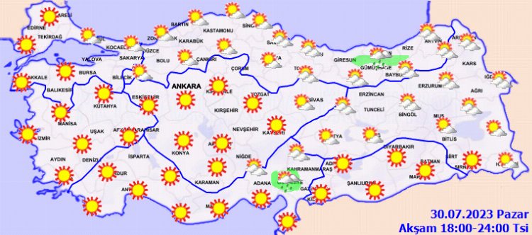 Hava sıcaklıklarında önemli bir değişiklik beklenmediği hava raporuna göre; kuzey kesimleri ile Doğu Akdeniz’in parçalı, yer yer çok bulutlu, Doğu Karadeniz kıyıları, Doğu Anadolu’nun kuzeydoğusu, Osmaniye, Ordu ve Artvin çevreleri ile Adana’nın kuzey ve doğu kesimlerinin yerel olmak üzere sağanak ve gök gürültülü sağanak yağışlı, diğer yerlerin az bulutlu ve açık geçeceği tahmin ediliyor.
