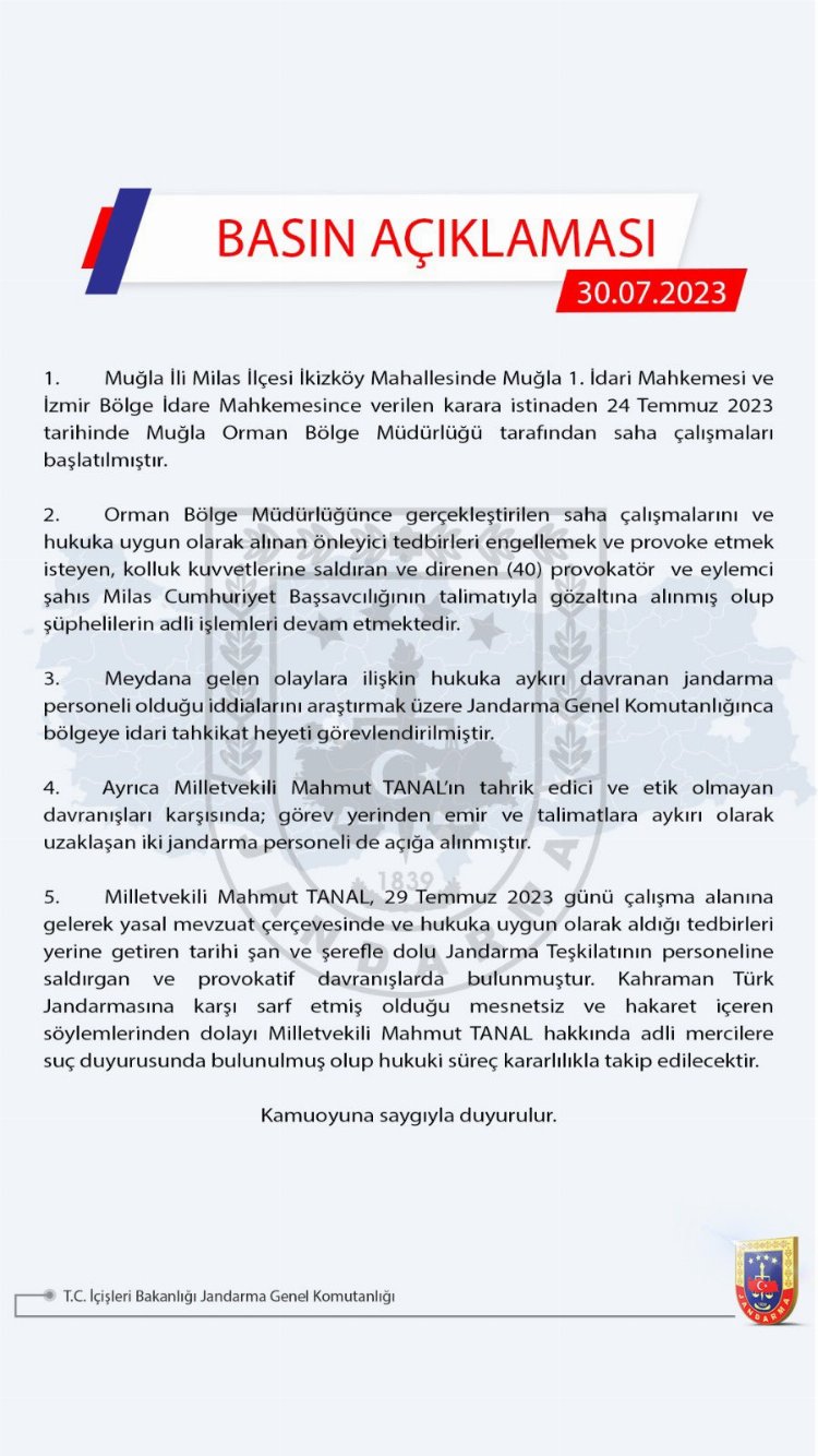 Muğla’nın Milas ilçesi İkizköy Mahallesi’nde meydana gelen olaylara yönelik Jandarma Genel Komutanlığı’ndan yazılı açıklama yapıldı. Jandamra iki personelin açığa alındığını, Milletvekili Mahmut Tanal’a ise suç duyurusunda bulunulduğunu duyurdu.