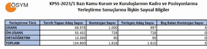 ÖSYM’den yapılan yazılı açıklamaya göre KPSS-2023/1’e ilişkin Bazı Kamu Kurum ve Kuruluşlarının Kadro ve Pozisyonlarına Yerleştirme sonuçları...