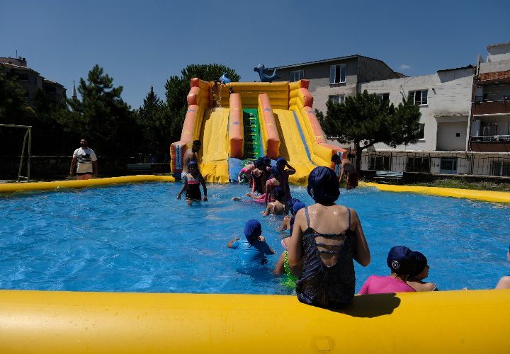Bursa Büyükşehir Belediyesi, ‘Neşeli Havuzlar Mutlu Çocuklar’ projesi kapsamında 3 ilçedeki 4 okul bahçesine kurduğu portatif yüzme...