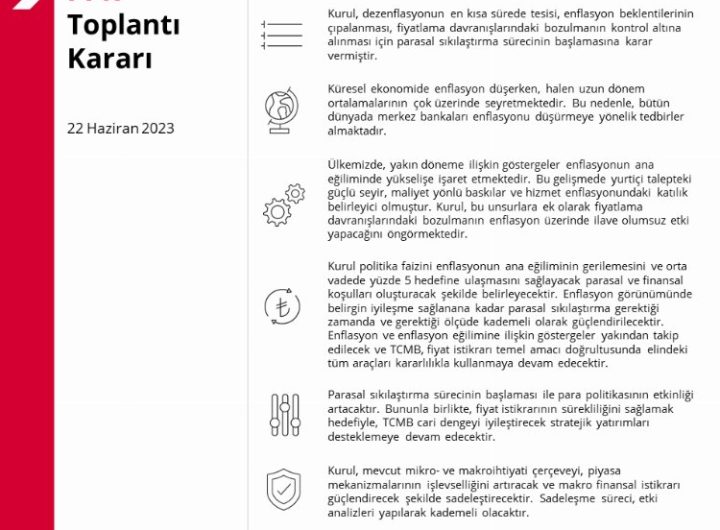 Merkez Bankası, Para Politikası Kurulu toplantısının özetini yayımladı. Özette, parasal sıkılaştırma sürecinin enflasyonda belirgin düşüş yaşanana kadar...