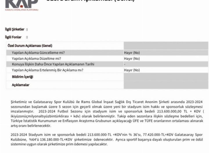 Galatasaray Kulübü’nün son sponsorluk anlaşması nedeniyle Kamuyu Aydınlatma Platformu’na (KAP) yaptığı bildirimde, Türkiye İstatistik Kurumu’nun (TÜİK) yanı...