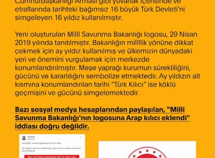 İletişim Başkanlığı bünyesindeki Dezenformayonal Mücadele Merkezi, Milli Savunma Bakanlığı (MSB)’nın logosuna Arap kılıcı eklendi” iddialarının doğruyu yansıtmadığını...