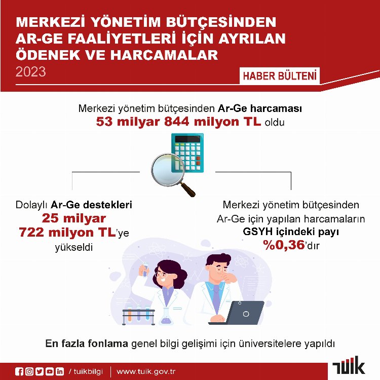 Merkezi yönetim bütçesinden yapılan Ar-Ge harcamalarının 15 trilyon 6 milyar 574 milyon TL olan Gayrisafi Yurt İçi Hasıla (GSYH) içerisindeki oranı ise yüzde 0,36 oldu.