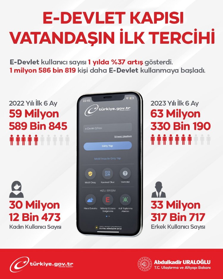 2023 yılının ilk yarısında e-devlet kullanıcı sayısı 63 milyon 330 bin 190 kişiye yükseldi. Önceki yılın ilk altı ayında kullanıcı sayımız 59 milyon 589 bin 845 kişiydi. E-Devlet kullanan vatandaşlarımızın sayısında yüzde 37’lik büyük bir artış gerçekleşti.