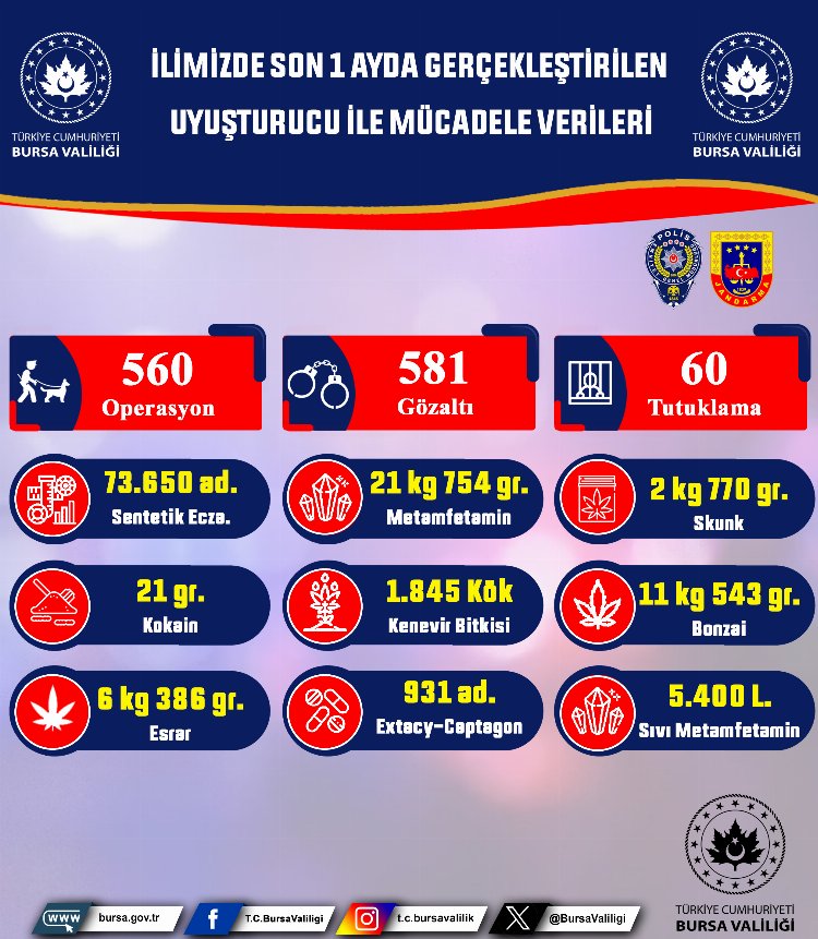 Bursa Valiliği, il genelinde Temmuz ayında gerçekleşen uyuşturucu ile mücadele verilerini paylaştı. Bursa’da bir ay içerisinde gözaltına alınan şüphelilerden 60’ı tutuklandı