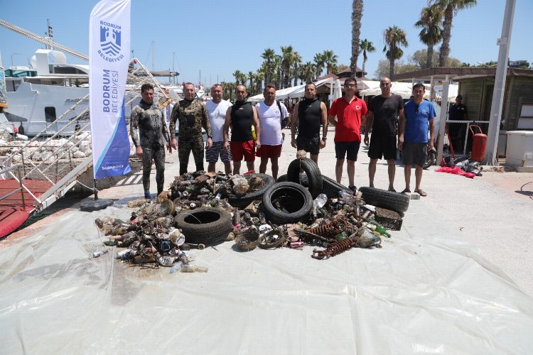 Yalıkavak İskelesi’nde yaklaşık 2 saat süren deniz dibi temizliğinde; 122 kg cam, 32 kg plastik, 74 kg metal, 196 kg araba lastiği ve 23 kg diğer atıklar olmak üzere toplam 447 kg atık çıkarıldı.