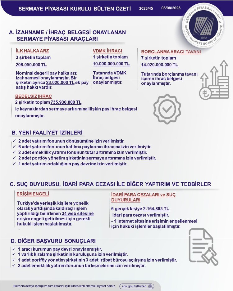 ANKARA (İGFA) – Sermaye Piyasası Kurulu (SPK), yayımladığı bültende 3 şirketin ilk halka arz izahnamesini onaylarken, 6 kişiye yaklaşık 2,2 milyon TL idari para cezası verdi.