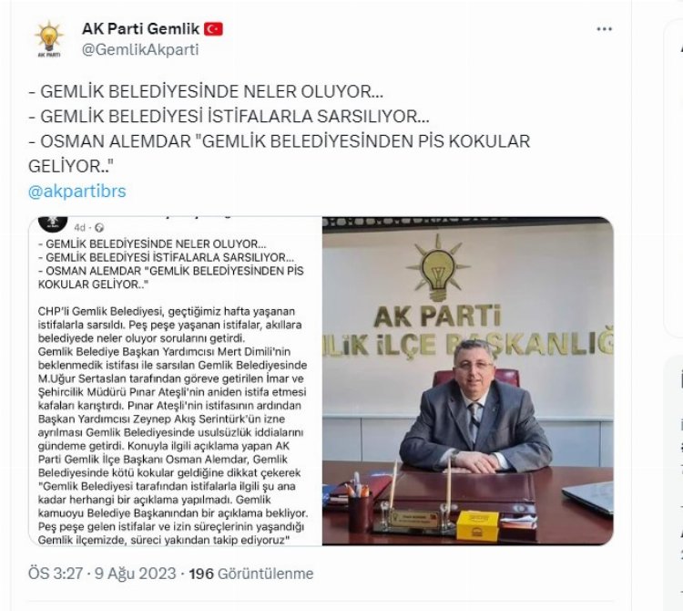 AK Parti Gemlik İlçe Başkanı Osman Alemdar, konuyu sosyal medyadan gündeme taşırken, AK Parti Gemlik İlçe Başkanlığı, resmi sosyal medya hesaplarından konuyla ilgili paylaşım yaptı.