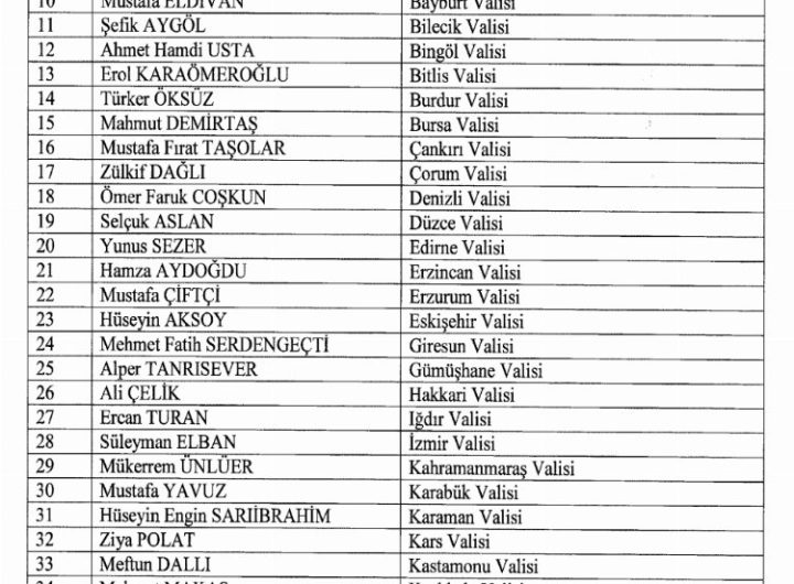 Cumhurbaşkanı Erdoğan’ın imzasıyla Resmi Gazete’de yayınlanan atama kararlarına göre; birçok şehrin valisi değişti. Cumhurbaşkanı Recep Tayyip Erdoğan’ın...