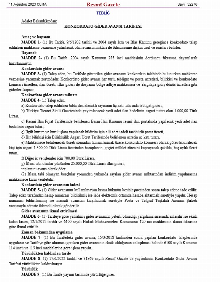 Söz konusu tebliğe göre belirlenen tarifedeki gider avansının 15 Mart 2018 tarihinden sonra yapılan konkordato taleplerinde uygulanacağı ve tarifeye göre alınması gereken gider avansının eksik olduğunun anlaşılması halinde 6100 sayılı Kanunun 114 üncü ve 115 inci maddelerine göre işlem yapılacağı bildirildi.