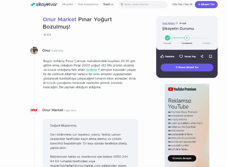 Sesini Şikayet Var sitesinden duyurmaya çalışan vatandaş, “Bugün Sefaköy Fevzi Çakmak mahallesindeki bayinize 20:30 gibi gittim almış olduğum Pınar 2000 yoğurt (82.99) ürünün ekşimiş ve bozuk olduğunu fark ettim. Sodexo almıştım. Kasadaki çalışan fiş de vermedi Allah’tan sadece bir ürün almıştım. Uygulamadan göstererek kanıtlamaya çalışacağım. Umarım inkar etmezler. Artık iki küçük çocuğumu bırakarak markette gitmek zorunda kalacağım. Bin pişman olduğum aldığıma” diye tepki gösterdi.