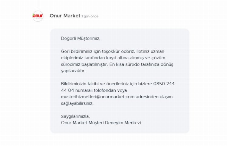 Onur Market ise, aynı sitede yapılan şikayete, “Bildiriminiz için teşekkür ederiz. İletiniz uzman ekiplerimiz tarafından kayıt altına alınmış ve çözüm sürecimiz başlatılmıştır. En kısa sürede tarafınıza dönüş yapılacaktır” yazısıyla otomatik bir mesaj atmakla yetindi.