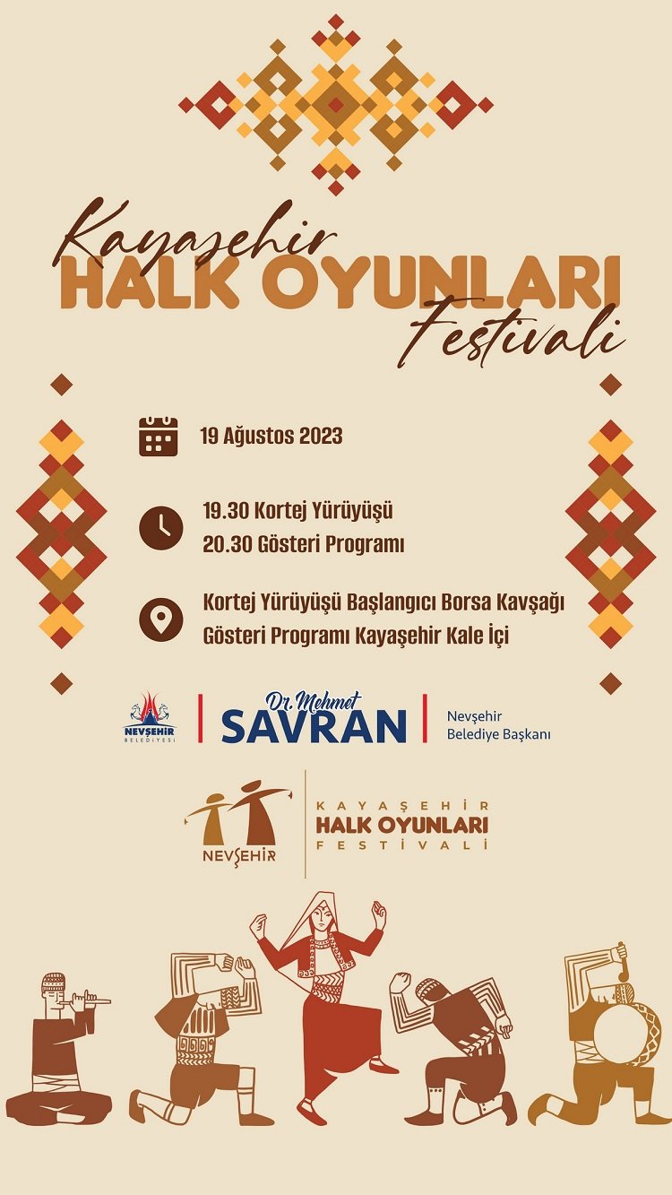 Nevşehir Belediyesi Gençlik ve Spor Hizmetleri Müdürlüğü tarafından bu yıl ilk kez düzenlenecek olan Kayaşehir Halk Oyunları Festivali için geri sayım başladı. Nevşehir Belediyesi’nin ev sahipliğinde gerçekleştirilecek olan festivale Nevşehir’in yanı sıra Sivas, Konya-Ilgın, Mersin-Toroslar, Kırşehir, Trabzon, Kayseri, Edirne, Bitlis-Tatvan, Denizli, Bursa-Orhangazi, Adana, İstanbul ve Kuzey Kıbrıs Türk Cumhuriyeti (KKTC)’den halk oyunları ekipleri katılacak.