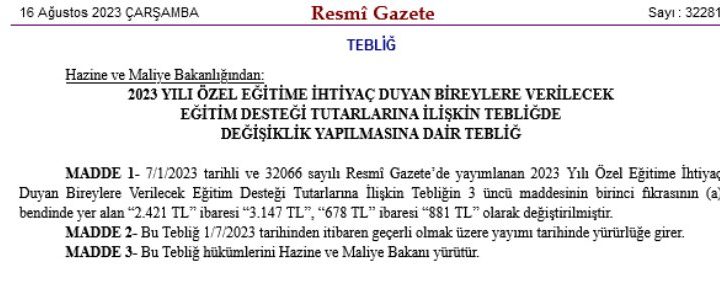 Hazine ve Maliye Bakanlığı, 2023 yılı özel eğitime ihtiyaç duyan bireylere verilecek eğitim desteği tutarlarında güncelleme yapıldı....