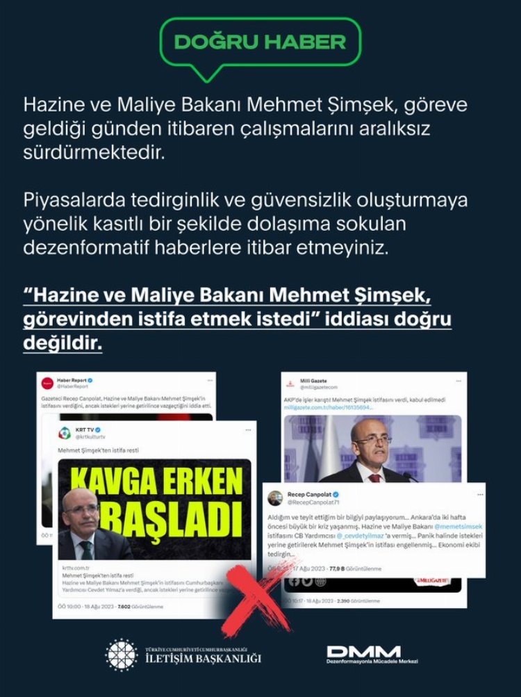 Piyasalarda tedirginlik ve güvensizlik oluşturmaya yönelik kasıtlı bir şekilde dolaşıma sokulan dezenformatif haberlere itibar edilmemesini isteyen Dezenformasyonla Mücadele Merkezi, Hazine ve Maliye Bakanı Mehmet Şimşek’in görevinden istifa etmek istediği yönündeki iddiaların doğru olmadığını açıkladı.