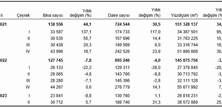 Yapı Ruhsatı İstatistikleri’ni yayımlayan TÜİK’in verilerine göre, bir önceki yılın aynı çeyreğine göre, 2023 yılı II. çeyreğinde...
