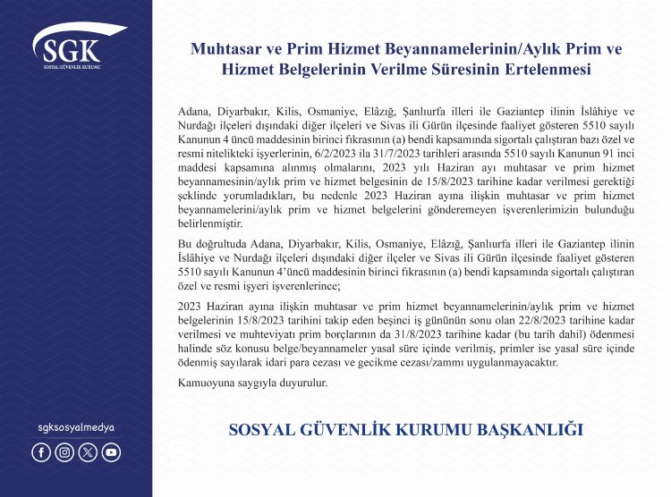 Buna göre sözkonusu açıklamada; 2023 yılı Haziran ayı muhtasar ve prim hizmet beyannamesinin/aylık prim ve hizmet belgesinin de 15.08.2023 tarihine kadar verilmesi gerektiği şeklinde yorumladıkları, bu nedenle 2023 Haziran ayına ilişkin muhtasar ve prim hizmet beyannamelerini/aylık prim ve hizmet belgelerini göndermeyen işverenlerimizin bulunduğunun belirlendiğine dikkati çekildi.