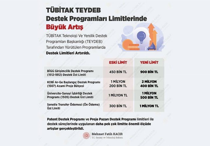 TÜBİTAK Teknoloji ve Yenilik Destek Programları Başkanlığı’nca yürütülen destek programlarının limitleri güncellendi. Patent Destek Programı ile Proje...