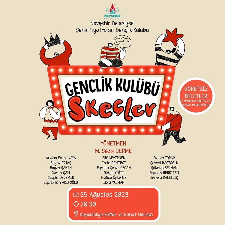 Nevşehir Belediyesi tarafından çocuklar ve gençler için düzenlenen Yaratıcı Drama ve Uygulamalı Tiyatro Kursu’na katılan çocuk ve gençler, 25 Ağustos 2023 Cuma akşamı Kapadokya Kültür ve Sanat Merkezi’nde ‘Gençlik Kulübü Skeçler’ adlı programda sahneye çıkacak.