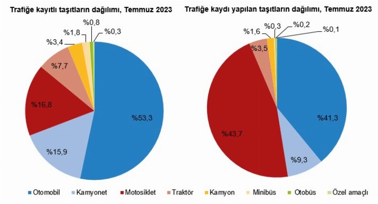 232 bin 253 adet taşıtın trafiğe kaydının yapıldığı Temmuz ayında trafiğe kaydı yapılan taşıtların yüzde 43,7’sini motosiklet, yüzde 41,3’ünü otomobil, yüzde 9,3’ünü kamyonet, yüzde 3,5’ini traktör, yüzde 1,6’sını kamyon, yüzde 0,3’ünü minibüs, yüzde 0,2’sini otobüs ve yüzde 0,1’ini özel amaçlı taşıtlar oluşturdu.