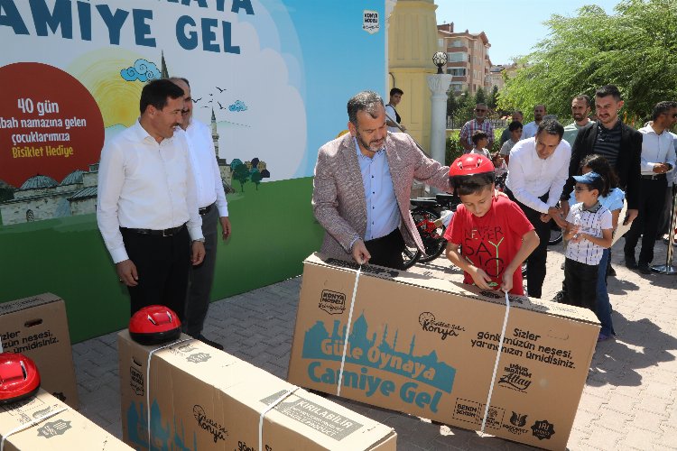 Konya Büyükşehir Belediye Başkanı Uğur İbrahim Altay, Güle Oynaya Camiye Gel Projesi kapsamında bisiklet almaya hak kazanan çocuklara bisikletlerini hediye etti.