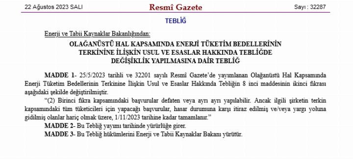 Deprem bölgesinde elektrik ve gaz borçlarının silinmesi için başvuru süresi 1 Kasım’a kadar uzatıldı. Karar bugünkü Resmi...