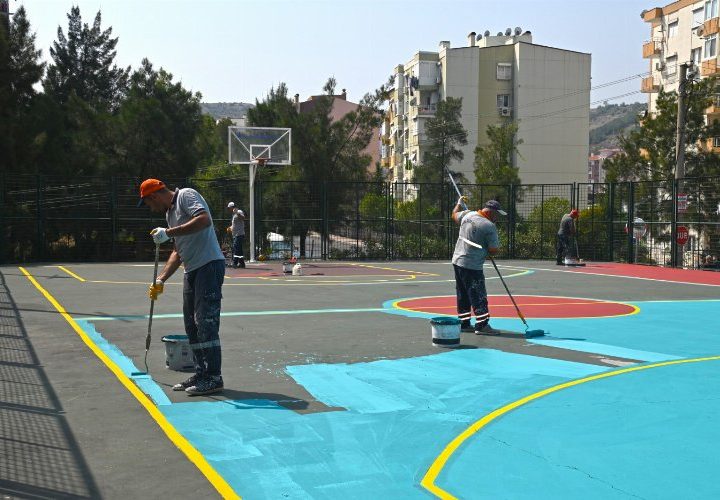 Karabağlar Belediyesi Fen İşleri Müdürlüğü ekipleri parklarda bulunan basketbol sahalarının bakım, onarım ve boyama çalışmalarına devam ediyor....