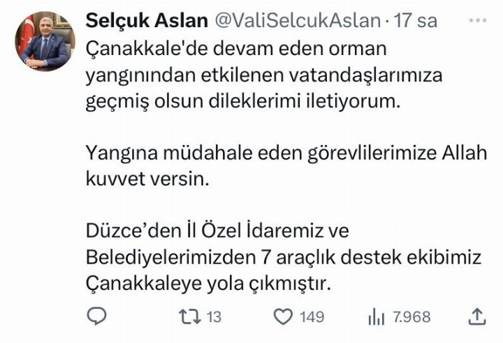 Düzce Valisi Selçuk Aslan, Çanakkale’de henüz kontrol altına alınaayan yangına yönelik Özel İdare ve belediyelerdne 7 araçlık...