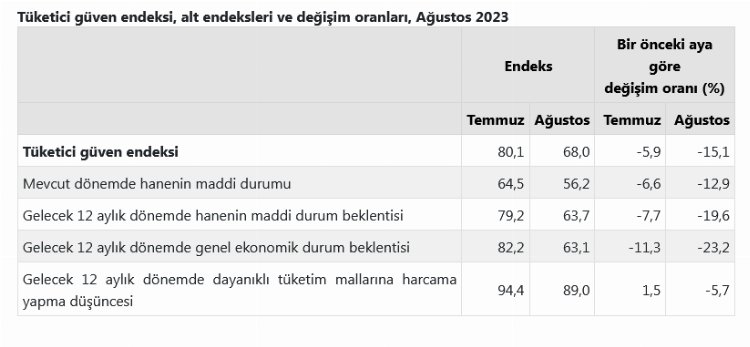 TÜİK ve Merkez Bankası işbirliği ile yürütülen tüketici eğilim anketi sonuçlarından hesaplanan Tüketici Güven Endeksi, Temmuz ayında 80,1 iken Ağustos ayında ,1 oranında azalarak 68,0 oldu.