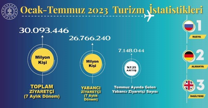 Türkiye, 2023 yılının ilk 7 ayında toplam 30 milyon 93 bin 446 ziyaretçiyi ağırlarken turizmde rekor yılı...