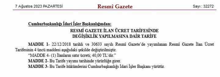 Resmi Gazete’de yayımlanan ilan ücretlerine zam yapıldı. ANKARA (İGFA) – Resmi Gazete’nin ilan ücretlerine zam yapıldı. Yeni...