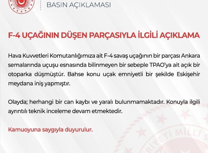 Ankara’da, Hava Kuvvetleri Komutanlığı’na ait F-4 savaş uçağının bir parçası, uçuş sırasında TPAO’ya ait açık bir otoparka...