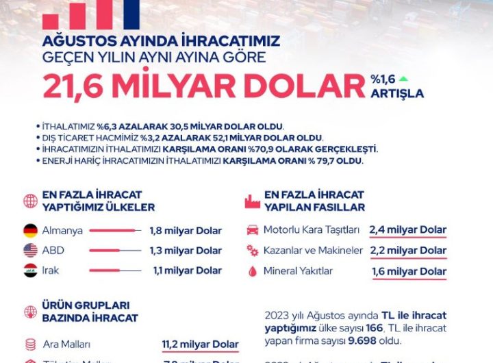 Ticaret Bakanı Ömer Bolat, sosyal medya hesabından yaptığı paylaşımda, Ağustos ayında ihracatın yüzde 1,6 oranında artışla 21...