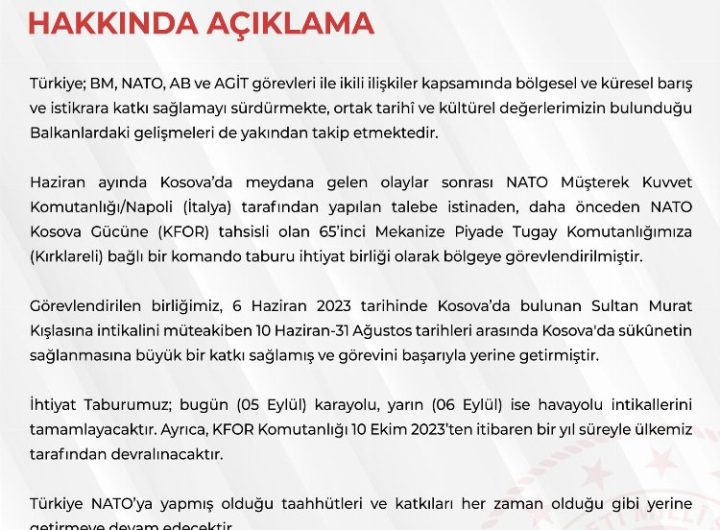 Milli Savunma Bakanlığı, Kosova’da görevlendirilen komando taburunun görevini tamamladığını ve yarın Türkiye’ye döneceğini açıkladı. ANKARA (İGFA) –...