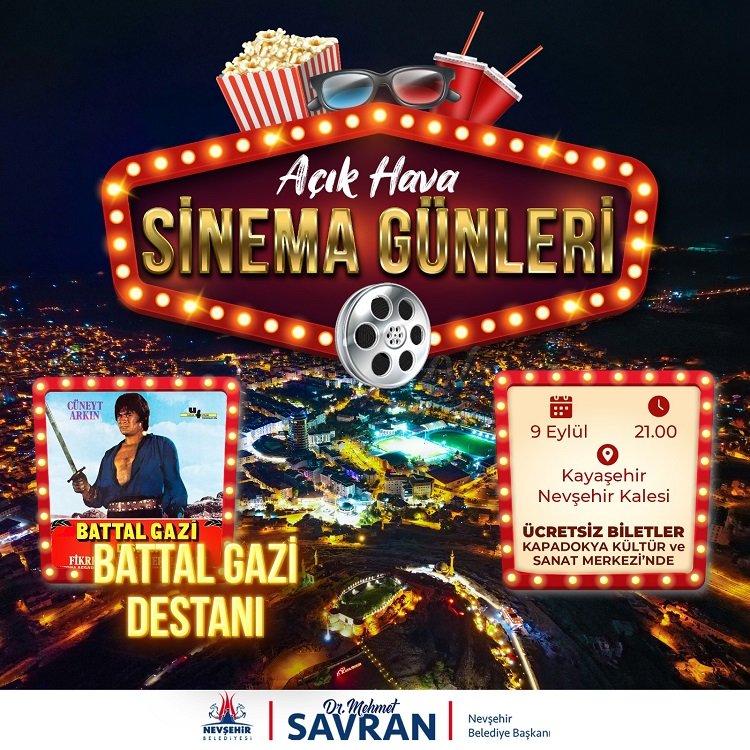 Nevşehir Belediyesi Kültür ve Sosyal İşler Müdürlüğü tarafından Nevşehir Kalesi içerisinde düzenlenen Açık Hava Sinema Günleri devam ediyor. Başladığı ilk günden itibaren etkinliğin beşinci haftasında Cüneyt Arkın, Meral Zeren ve Fikret Hakan’ın başrollerinde yer aldıkları Yeşilçam’ın unutulmaz filmlerinden ‘Battal Gazi Destanı’ gösterilecek.