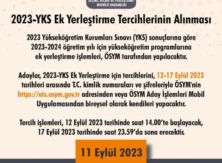 ÖSYM, YKS ek yerleştirme işlemlerinin başladığını açıkladı. “2023 Ek Yerleştirme Kılavuzu” ile boş kontenjanlar duyuruldu. ANKARA (İGFA)...