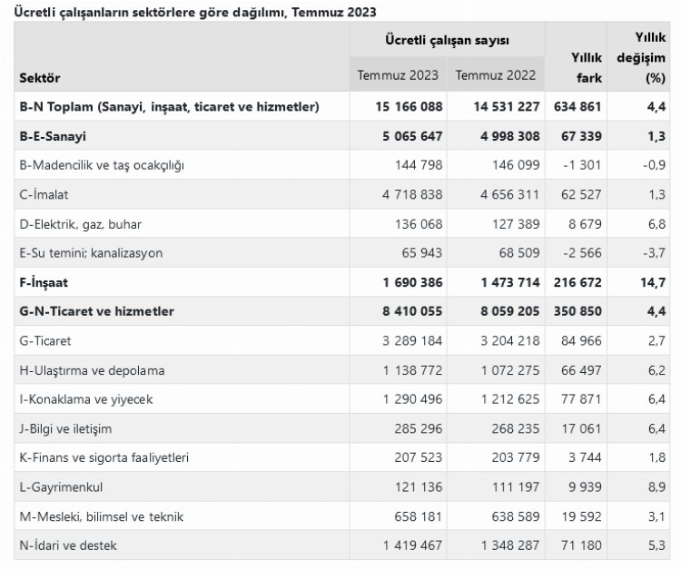 Buna göre, sanayi, inşaat ve ticaret-hizmet sektörleri toplamında ücretli çalışan sayısı Temmuz’da bir önceki yılın aynı ayına göre yüzde 4,4 arttı. Ücretli çalışan sayısı bir önceki yılın aynı ayında 14 milyon 531 bin 227 kişi iken, 2023 yılı Temmuz ayında 15 milyon 166 bin 88 kişi oldu.