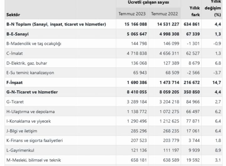 Ücretli çalışan sayısı, Temmuz ayında geçen yılın aynı ayına göre yüzde 4,4 artış göstererek 15 milyon 166...