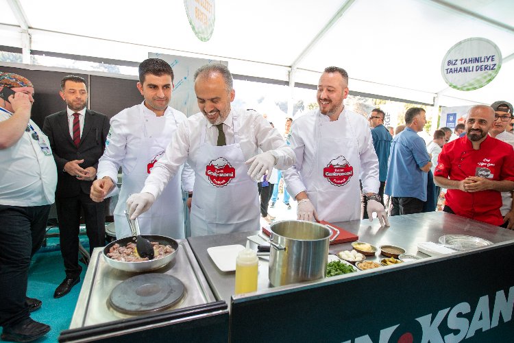 Festivalin açılış töreninde konuşan Bursa Büyükşehir Belediye Başkanı Alinur Aktaş, gastronomi festivalinin bu yıl ikincisini gerçekleştirmenin heyecanını yaşadıklarını söyledi. Geçen yılki festivalden mükemmel sonuçlar elde ettiklerini ve festivalin hemen ardından konunun tarafları ile toplanıp, ‘neler eksikti’ ve ‘daha neler yapılabilir’ konularını irdelediklerini ifade eden Başkan Aktaş, “Bursa sahip olduğu tüm değerlerin yanında aynı zamanda bir turizm şehri. Turizmin en büyük tetikleyicilerinden bir tanesi de gastronomi. Turist geldiğinde yemek istiyor, içmek istiyor. İşte bu noktada var olan potansiyelimizi en iyi şekilde değerlendirmek istiyoruz. Allah’a hamdolsun çok da güzel gidiyoruz. Bu seneki parolamız da ‘Yeşil Bursa Yeşil Gastronomi’. Çünkü bizim 30 tane coğrafi işaretli ürünümüz var. 5 tane de bekleyen var. En son Yenişehir Biberi ve Keles Kirazı’nın tescilini aldık. Bursa ürünün topraktan ta ki sofrada yemeğe dönüşene kadarki sürecin tüm aşamalarına ev sahipliği yapıyor. Bu ürünlerin hepsi Bursa’da yetişiyor. Burada sadece Bursa’nın ürünleri değil, Erzurum’un cağ döneri de var Urfa’nın kebabı da var. Çünkü Bursa gerçekten renkli bir mozaik. Bursa’da 80 vilayeti, Balkanları Kafkasları bulabilirsiniz. Burada kadın kooperatiflerimiz var. Yine depremzede 11 ilimize davet gönderdik. 8 ilimizden dernekler burada. Emeği geçenlere, burada olup bizlere güç verenlere teşekkür ediyorum. Festivalimiz hayırlı olsun” diye konuştu.