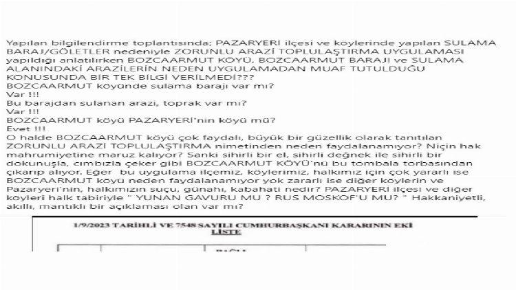 “Bozcaarmut köyünde sulama barajı var mı? var !!! bu barajdan sulanan arazi, toprak var mı? var !!! Bozcaarmut köyü Pazaryeri’nin köyü mü? evet !!! o halde Bozcaarmut köyü çok faydalı, büyük bir güzellik olarak tanıtılan zorunlu arazi toplulaştırma nimetinden neden faydalanamıyor? niçin hak mahrumiyetine maruz kalıyor? sanki sihirli bir el, sihirli değnek ile sihirli bir dokunuşla, cımbızla çeker gibi Bozcaarmut köyü’nü bu tombala torbasından çıkarıp alıyor. Eğer bu uygulama ilçemiz, köylerimiz, halkımız için çok yararlı ise Bozcaarmut köyü neden faydalanamıyor yok zararlı ise diğer köylerin ve Pazaryeri’nin, halkımızın suçu, günahı, kabahati nedir? Hakkaniyetli, akıllı, mantıklı bir açıklaması olan var mı?”