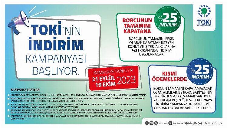 TOKİ’den yapılan açıklamaya göre, yüzde 25 indirim kampanyası bugün başlayıp, 19 Ekim’de sona erecek. Borcunu peşin ödeyen konut ve iş yeri alıcıları için yüzde 25 oranında indirim yapılacak.