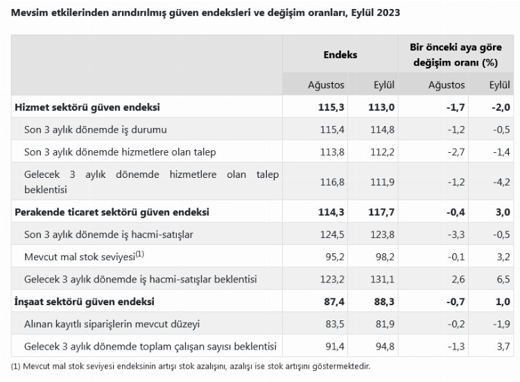 Güven endeksi Eylül ayında geçen aya kıyasla hizmet sektöründe yüzde 2 oranında azalırken, perakende ticaret sektöründe yüzde 3, inşaat sektöründe yüzde 1 arttı.